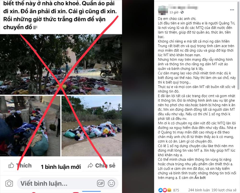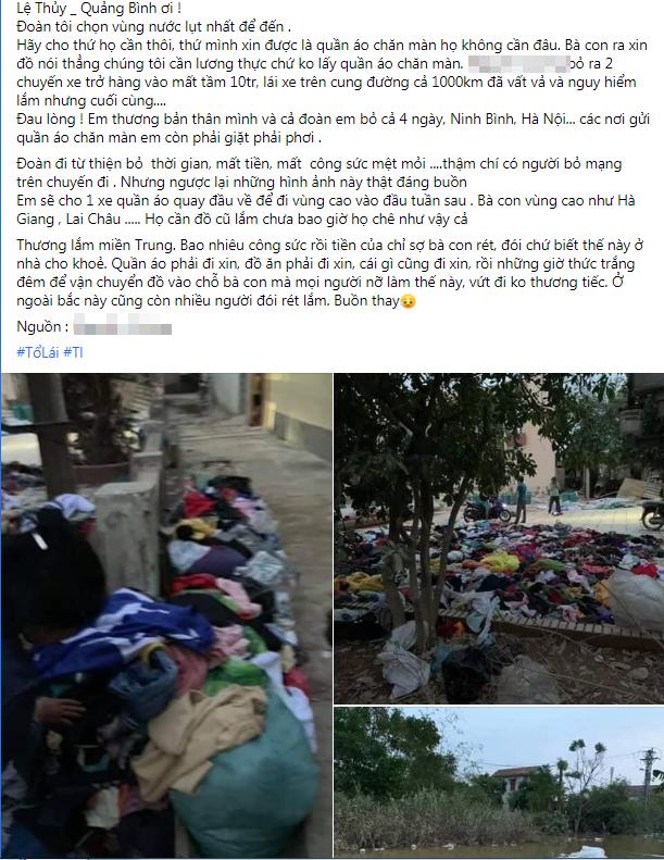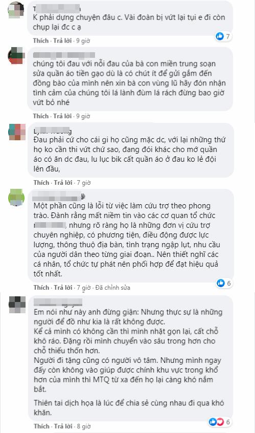 Mọi người ơi không có chuyện người dân vứt đồ mà các mạnh thường quân lặn lội đường xa nguy hiểm đưa đến như vậy đâu. Nhà em ở Quảng trị may mắn đất cao nhưng em đã theo chân mấy anh chị đi từ thiện thấy áo không có mang, cơm không có ăn nên làm gì có chuyện đó".