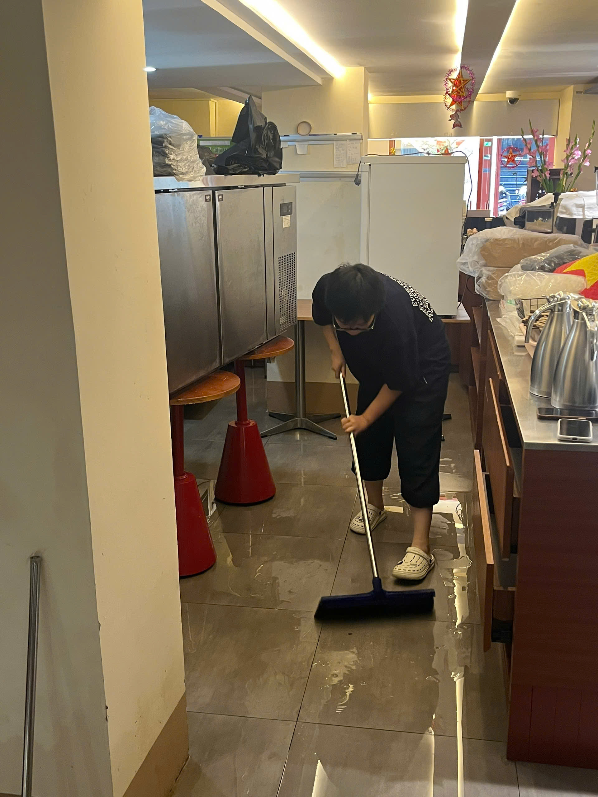 "Khi chúng tôi tìm kiếm mặt bằng tại đây, hoàn toàn không biết có cảnh ngập nước sau mưa lớn như thế này. Tình trạng ngập sâu khiến trang thiết bị và nội thất của quán thiệt hại nặng nề. Thêm vào đó, sau mỗi đợt ngập, quán phải đóng cửa 4-5 ngày dọn dẹp, tổng vệ sinh nên thiệt hại kinh tế cũng lớn", anh Hiếu cho biết.