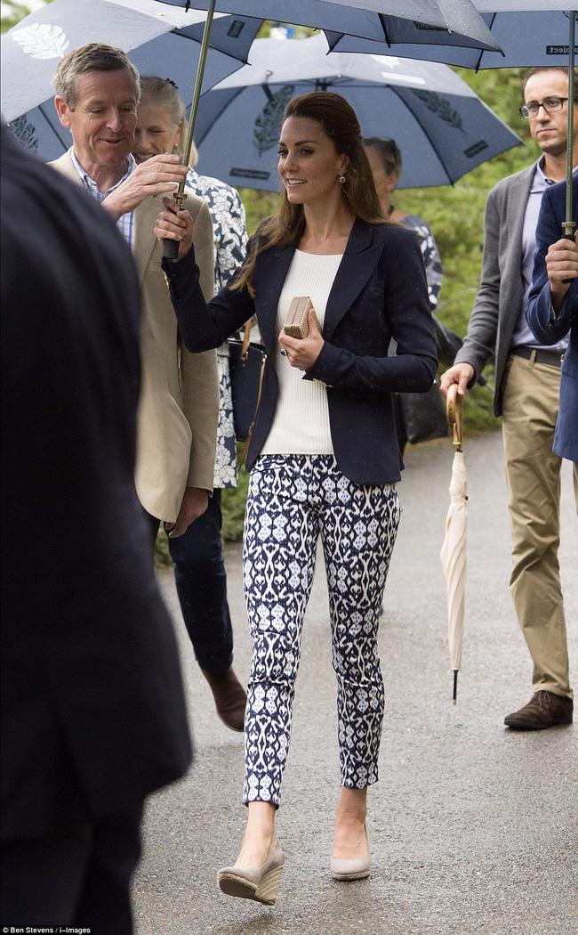 Trong chuyến công tác cùng hoàng tử William cách đây ít ngày, công nương Kate đã diện một chiếc quần ôm sát có họa tiết khá nổi bật. Chiếc quần này có thể khá bình thường đối với nhiều cô gái nhưng lại là một lựa chọn vô cùng táo bạo của Kate bởi cô rất hiếm khi diện quần bó và mỏng đến như vậy khi xuất hiện trước công chúng. Chiếc quần đã nhanh chóng được "soi" ra là đến từ thương hiệu Gap và hiện đang được giảm giá chỉ còn 24,99 USD ~ 560.000 VNĐ.