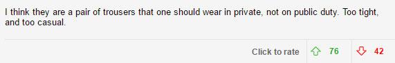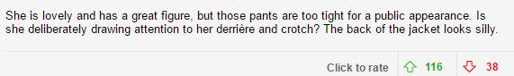 Tuy nhiên lần này đã không có lời khen nào dành cho lựa chọn thời trang giá rẻ của công nương. Sau khi chiêm ngưỡng hình ảnh của Kate, nhiều cư dân mạng đã nhận xét rằng chiếc quần này quá bó, trông chẳng khác nào legging và không phải là thứ phù hợp để một công nương diện khi đang thực hiện nhiệm vụ hoàng gia. Ngoài ra, chiếc áo khoác Kate diện còn có thiết kế hớt ngắn đằng sau và chi tiết này được cho là càng đổ dồn sự chú ý vào vòng 3 của cô, khiến diện mạo của công nương mất đi sự tinh tế, thanh lịch.