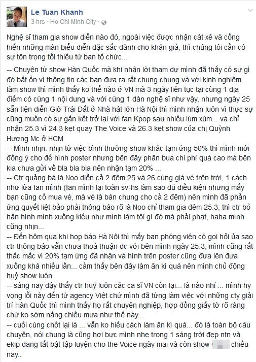 Sau thông báo bất ngờ của BTC chương trình MBC Music K-Plus Concert in Vietnam về việc hủy bỏ suất diễn của các nghệ sĩ Việt Nam, quản lý của ca sĩ Noo Phước Thịnh cho biết, ngay từ trước khi có quyết định thiếu tôn trọng từ ban tổ chức, phía Noo Phước Thịnh đã chọn cách chuyển hoàn lại 20% cát-sê mà chương trình ứng trước cho nam ca sĩ.