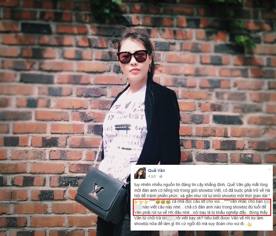 Trước ồn ào thị phi, Quế Vân quyết định lên tiếng một lần cho rõ. Chân dài gốc Hà Thành khẳng định: "Không có đàn anh nào trong showbiz đủ tuổi để Vân phải rút lui về Hà Nội... Nói bậy là bị khẩu nghiệp đấy. Đừng thấy Vân từ chối trả lời rồi viết bậy. Nếu biết Vân về Hà Nội không làm showbiz nữa để làm gì thì cứ ngồi đó mà suy đoán cho vui đi".