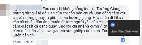 "Fan của chị không bằng fan của Trường Giang nhưng đừng vì lẽ đó. Fan của chị còn bên chị và luôn đồng cảm với chị về những gì xảy ra giữa chị và Trường Giang. Hãy quên đi tất cả còn rất nhiều đàn ông muốn được làm người yêu của chị. Hãy quên cảm giác tất cả đang quay lưng với chị nhé và đừng vì chuyện tình cảm mà chôn vùi tương lai và sự nghiệp của mình. Fan luôn bên chị", bình luận nhắn gửi của người hâm mộ được Quế Vân thả like.