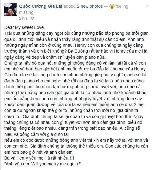 Trước đây Cường đô la đã từng công khai cầu hôn với Hồ Ngọc Hà trên facebook nhưng chỉ nhận được sự im lặng từ phía nữ ca sĩ, lần này 'anh' lại tiếp tục bày tỏ một lần nữa với mẹ Subeo. Mặc dù những tâm sự mũi mẫn này rất được các chị em ủng hộ, thậm chí còn những bình luận rằng mong Cường đô la và Hồ Ngọc Hà tái hợp nhưng người đọc lại quên mất rằng, khoảng 4 ngày trước anh đã tuyên bố 'đóng cửa' các tài khoản mạng xã hội.