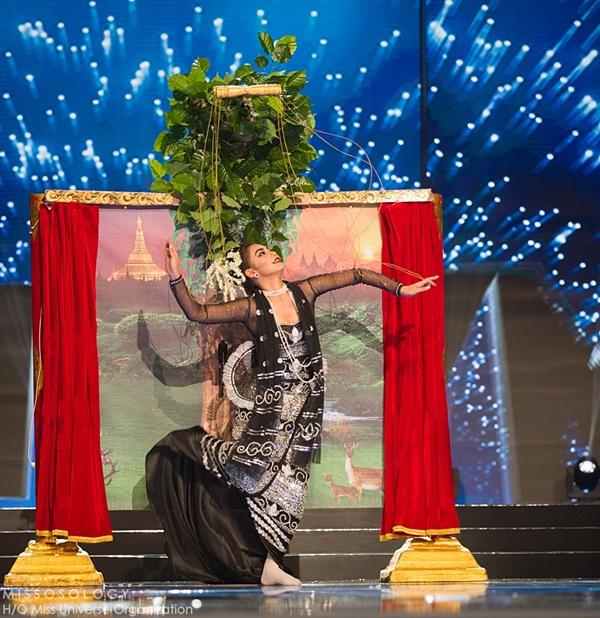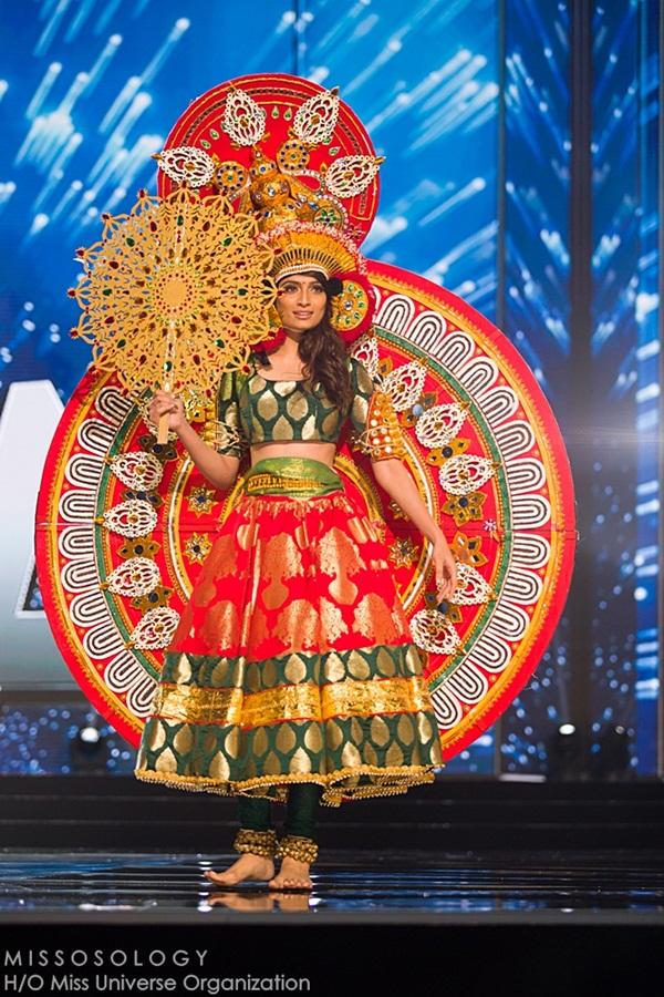 Hạng 1: Quốc phục của Hoa hậu Myanmar. Cô "vác" cả một bức tranh đặc sắc lên sân khấu.