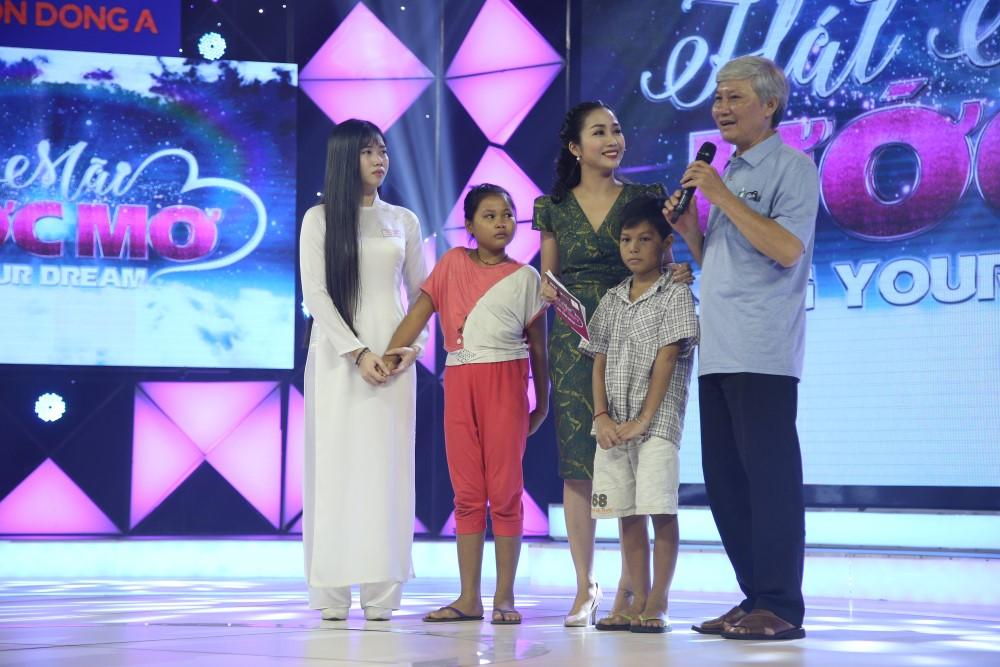 Phương Thảo cùng hai em bé Vân và Đức trên sân khấu.