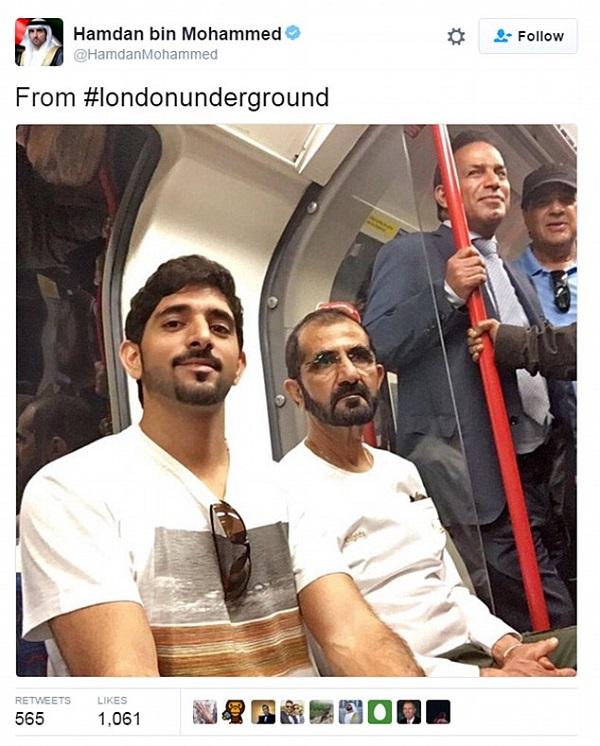 Không xuất hiện với bộ quần áo truyền thống hay sang chảnh với phi cơ hay siêu xe, lần này Hoàng tử vạn người mê cùng Quốc vương Dubai Sheikh Mohammed bin Rashid Al Maktoum cùng mặc những bộ quần áo đơn giản, hiện đại và di chuyển bằng tàu điện ngầm khi có chuyến du lịch tới London, Anh Quốc.