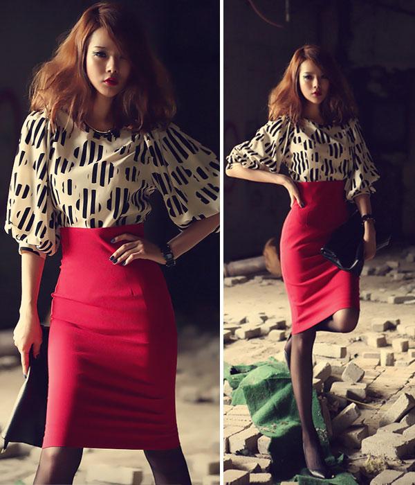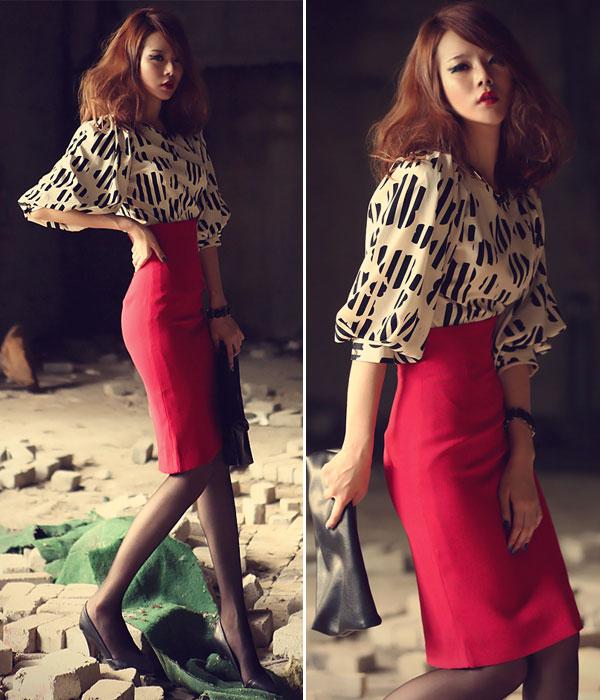 Đối với những chiếc váy gam màu đỏ, bạn có thể phối cùng áo sơ mi trắng, áo họa tiết hoặc