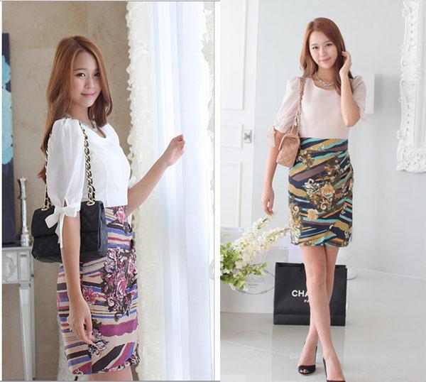 Khi chọn chân váy họa tiết thì bạn phải chọn áo một gam màu, tránh chọn áo họa tiết đi cùng