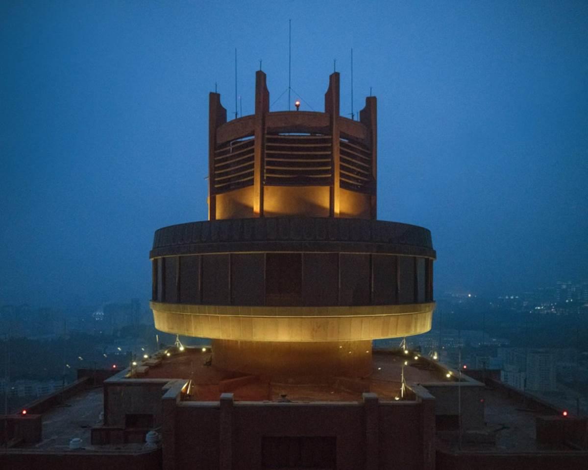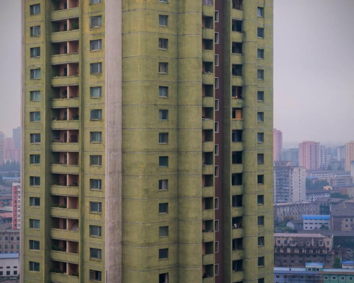 Các tòa nhà bê tông khổng lồ sơn màu sáng nổi bật trên nền trời thành phố. Những công trình này được xây dựng để thể hiện sức mạnh, sự bền bỉ và tinh thần dân tộc.