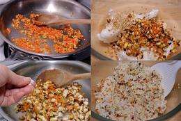 Bạn lấy muôi, thìa hoặc găng tay nilon để trộn đều cơm, trứng, cà rốt, nấm hương và rong biển vụn với nhau, cho thêm vừng rang và dầu mè cho cơm thơm dẻo hơn. Tiếp đến bạn dùng cơm đã trộn tạo thành những viên tròn đều nhau.