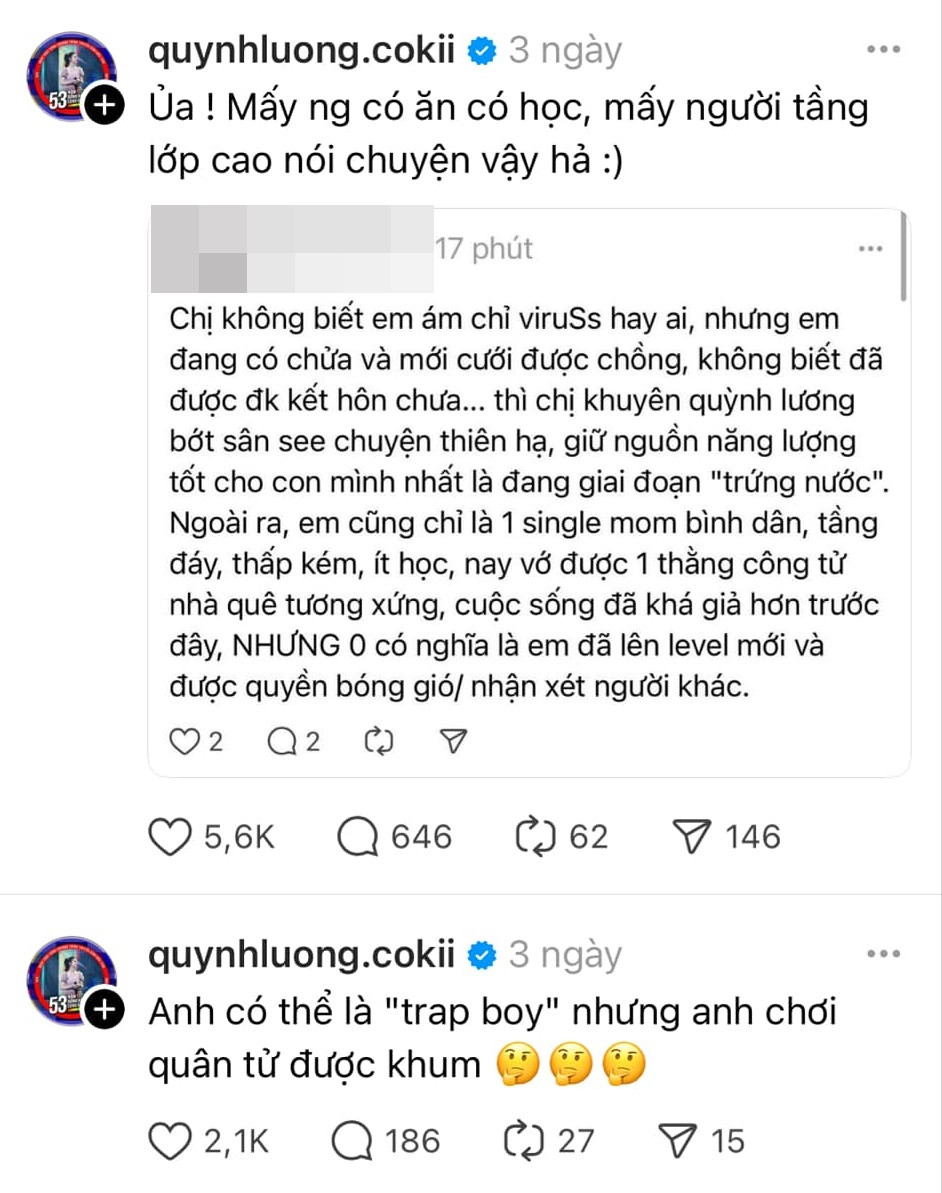 Theo đó, một người đã để lại comment gay gắt: "Chị không biết em ám chỉ ViruSs hay ai nhưng em đang có chửa và mới cưới được chồng, không biết đã được đăng ký kết hôn chưa thì chị khuyên Quỳnh Lương bớt sân si chuyện thiên hạ, giữ nguồn năng lượng tốt cho con mình. Em cũng chỉ là single mom bình dân, tầng đáy, thấp kém, ít học, nay vớ được 1 công tử nhà quê tương xứng, cuộc sống đã khá giả hơn trước nhưng không có nghĩa là đã lên level mới và được quyền bóng gió/ nhận xét người khác".