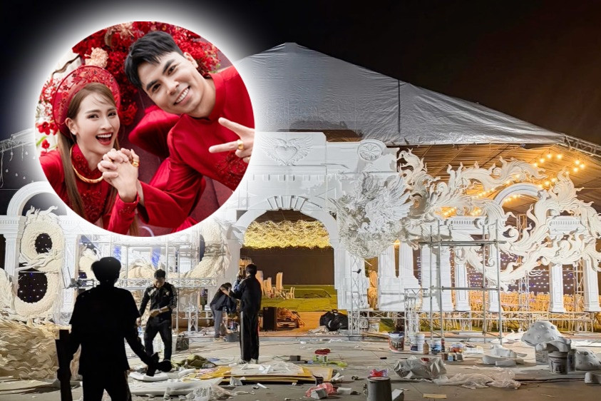 Theo hình ảnh được chia sẻ, khu vực tổ chức đám cưới đang được dựng rạp với quy mô rất lớn. Phía ngoài cổng nổi bật với mô hình rồng vàng khổng lồ, được lắp đặt cầu kỳ, tạo cảm giác bề thế ngay từ lối vào. Công nhân và đội trang trí vẫn đang gấp rút hoàn thiện các chi tiết cuối cùng để kịp ngày trọng đại.