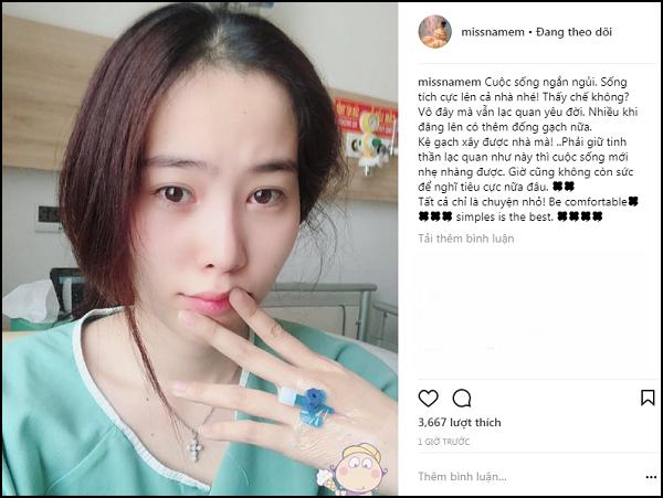 Giờ cũng không còn sức để nghĩ tiêu cực nữa đâu. Tất cả chỉ là chuyện nhỏ! Hãy thoải mái lên, đơn giản là điều tốt đẹp nhất", Nam Em viết.