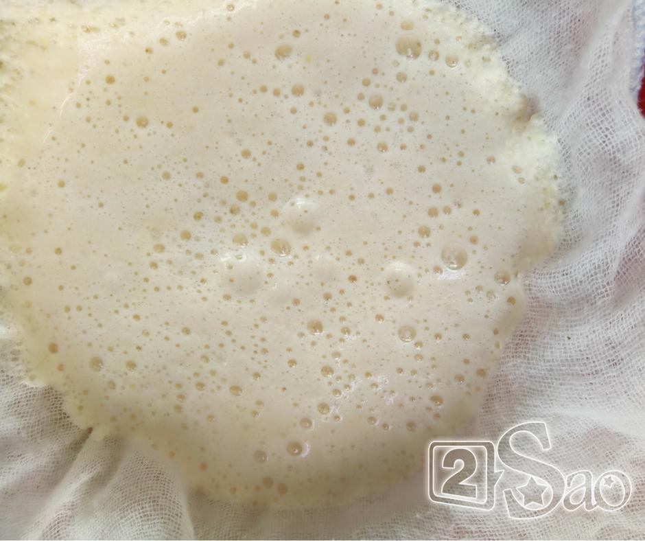 Bước 1: Đậu nành ngâm qua đêm, sau đó bóc bỏ vỏ. Cho đậu nành và 1.5 l nước lạnh vào máy xay nhuyễn. Dùng vải xô lọc lấy nước và bỏ bã.