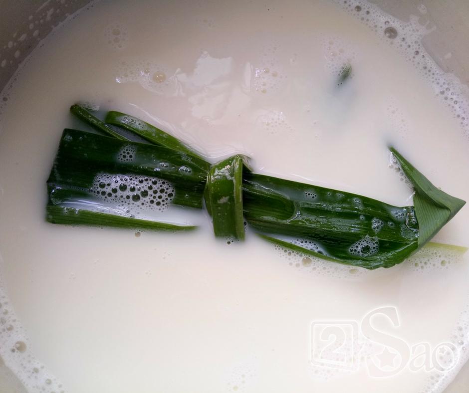 Bước 2: Cho sữa đậu nành vào nồi, thêm 1 chiếc lá nếp vào nấu cùng. Vừa đun vừa khuấy để tránh sữa không bị khê.