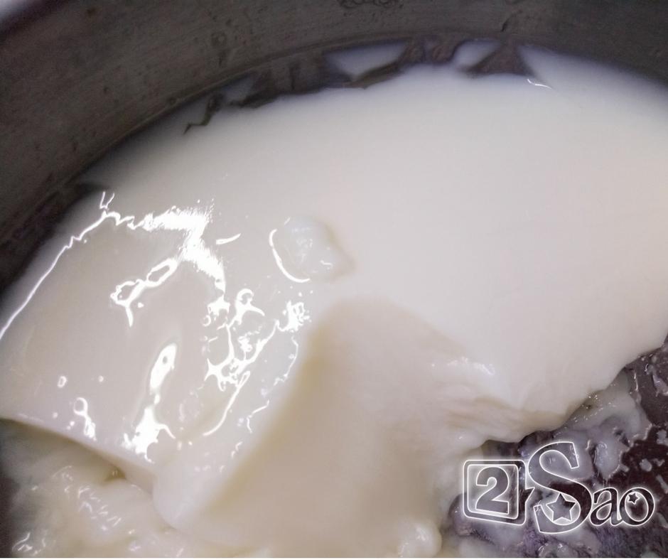 Bước 4: Vớt lá gelatin thả vào nồi sữa và khuấy đều. Sau đó đổ vào âu sạch đợi nguội, dùng màng bọc bọc lại và cho vào ngăn mát đợi tào phớ đông lại.