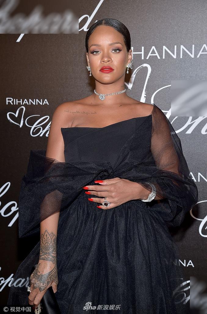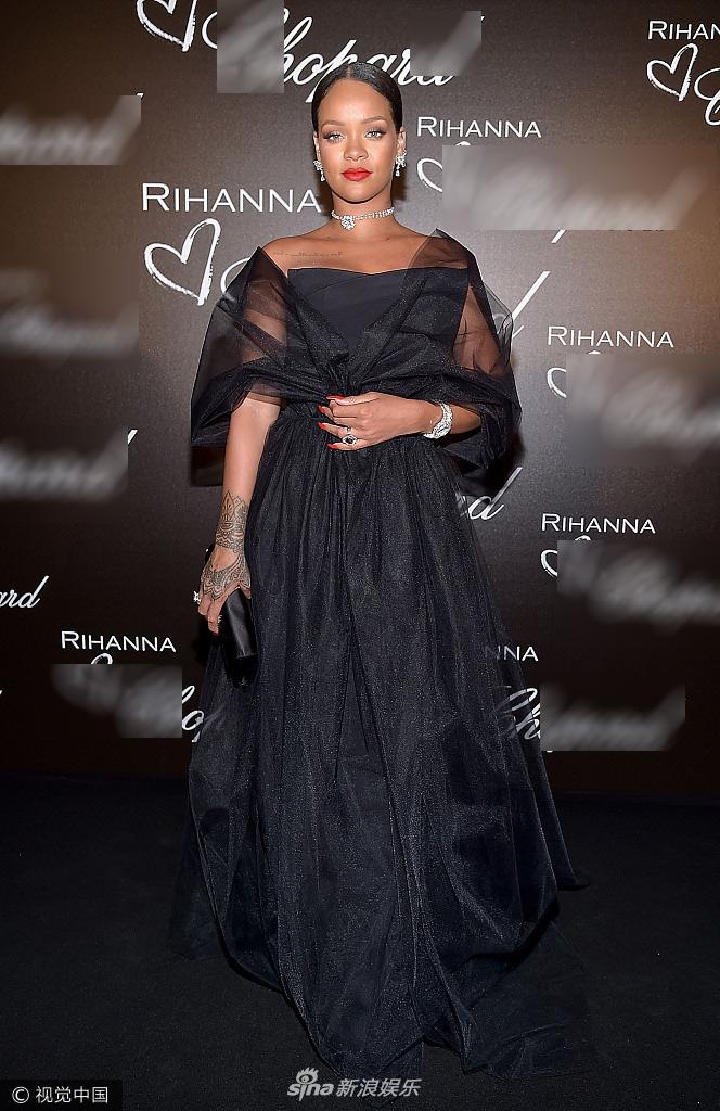 Xuất hiện đầy quyền lực trên thảm đỏ liên hoan phim Cannes 2017, "nữ hoàng nhạc số" Rihanna gây ấn tượng với bộ cánh màu đen chất liệu vải tuyn nhũ huyền bí.