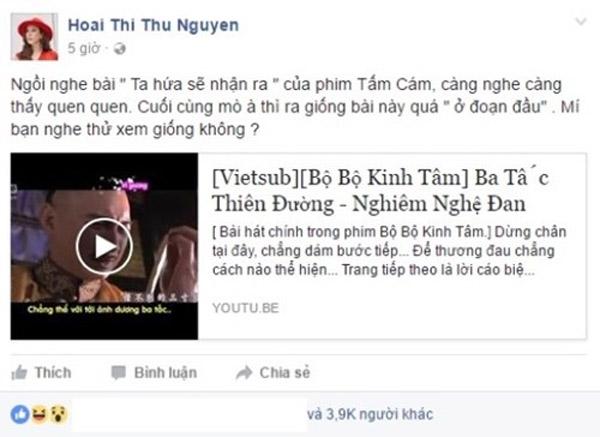 Tuy nhiên, mới đây hoa hậu Thu Hoài, vừa chia sẻ ý kiến gây tranh cãi liên quan đến "Ta hứa sẽ nhận ra". Trên mạng xã hội, Thu Hoài chia sẻ: “Ngồi nghe bài "Ta hứa sẽ nhận ra" của phim Tấm Cám, càng nghe càng thấy quen quen. Cuối cùng mò à thì ra giống bài này quá “ở đoạn đầu" . Mí bạn nghe thử xem giống không?”