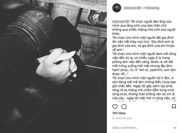 Giữa nghi án chia tay, cô gái trẻ bất ngờ đăng tải dòng trạng thái ngọt ngào về chuyện tình yêu, không quên đính kèm hình ảnh tay trong tay với một người bí ẩn. Danh tính người bí ẩn này được cho là chính Soobin Hoàng Sơn.