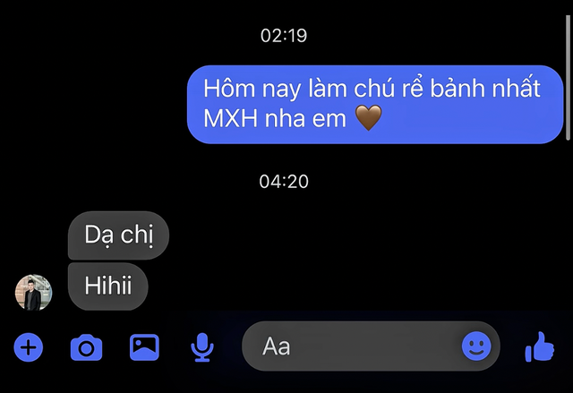 Cụ thể, vào lúc hơn 2h sáng người này gửi một tin nhắn: “Hôm nay làm chú rể bảnh nhất mạng xã hội nha em”, đáp lại chồng Đỗ Hà cho hay: "Dạ vâng ạ, hihi". Chỉ cần 4 chữ ngắn ngủi này thôi cũng đủ thấy nam thiếu gia là người cởi mở, lễ phép.