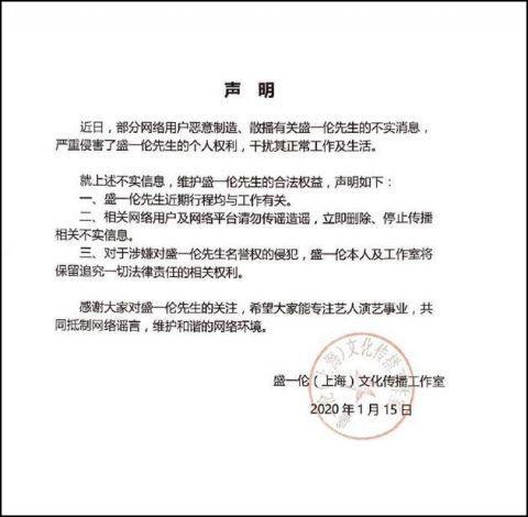 Ngay sau tin đồn, công ty quản lý của Thịnh Nhất Luân đã phải ra văn bản thông báo, khẳng định những thông tin trên là sai sự thật.