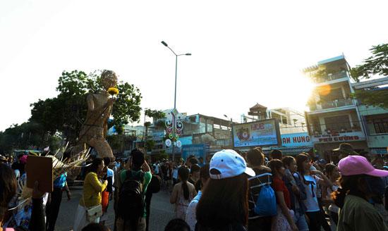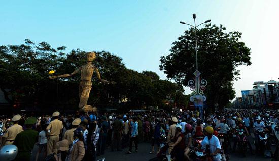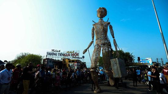 Chú rối đi dạo một vòng tại thành phố Huế vào lúc 16h chiều nay, hành trình xuất phát từ công viên Trịnh Công Sơn ra đến cầu Trường Tiền, Chợ Đông Ba rồi trở về nơi ban đầu.