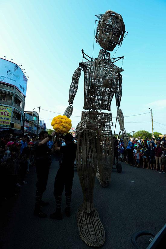 Chú rối di chuyển trên đường phố Huế khá nhịp nhàng với bông hoa duyên dáng trên tay.
