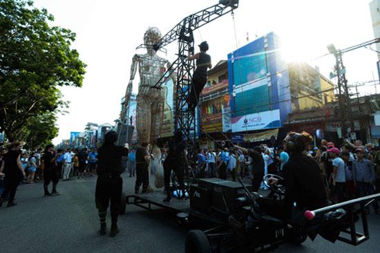 Đây là một phần của vở quảng diễn đường phố đặc sắc ‘Những vì sao trong đêm tối’, mà Đoàn nghệ thuật L'Homme Debout (Cộng hòa Pháp) mang đến với Festival Huế 2016.