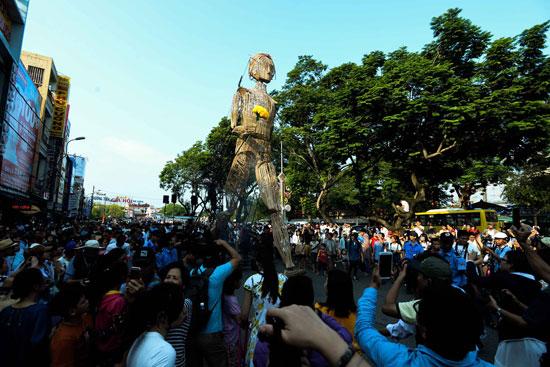 Có rất nhiều người dân và du khách tập trung tại nơi diễn ra màn trình diễn để được chiêm ngưỡng chú rối khổng lồ này trên nền nhạc sôi động.