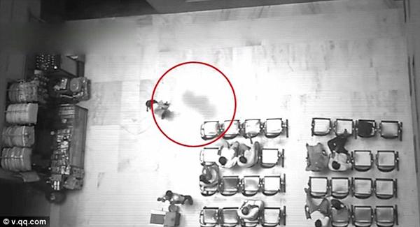 Ban đầu, người phụ nữ đứng nói chuyện ở cửa sổ của phòng chờ, mọi thứ đều rất bình thường. Nhưng khi cô bước ra khỏi cửa sổ đi về phía bên kia của căn phòng thì đột nhiên xuất hiện một bóng đen đi theo cô ra khỏi phòng chờ.