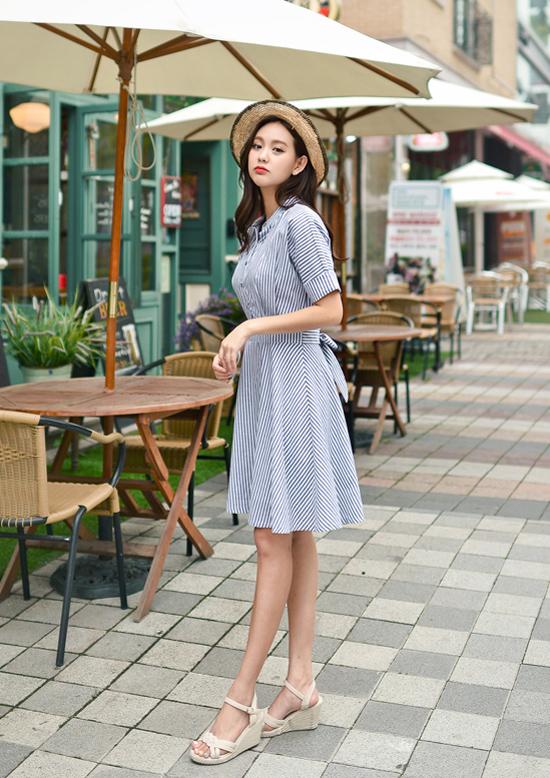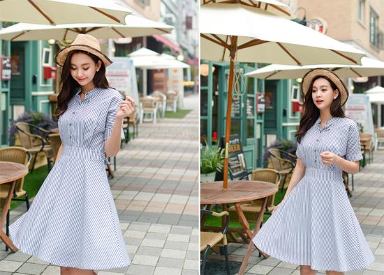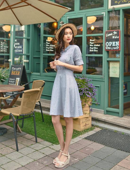 Các chiếc váy liền thân dáng xòe, màu xanh, họa tiết kẻ, họa tiết nhỏ nhắn rất thích hợp cho bạn gái dáng người tam giác ngược. Phần váy xòe bên dưới sẽ giúp cho vòng hông vốn nhỏ của bạn thêm "căng tròn" hấp dẫn.