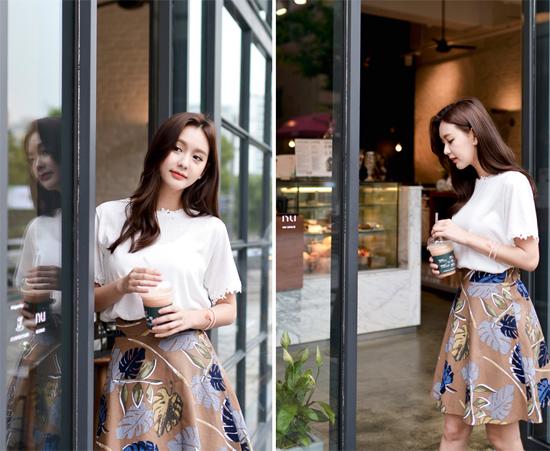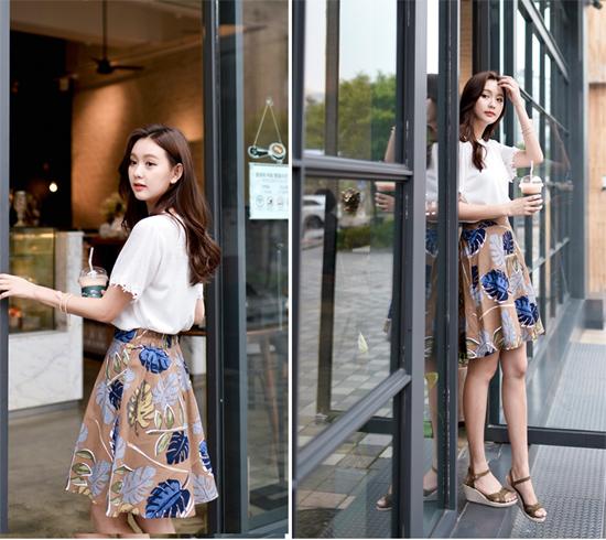 Áo sơ mi và chân váy xòe là hai item luôn có trong tủ quần áo của chị em công sở. Hai món đồ này khi kết hợp với nhau sẽ tạo nên diện mạo nữ tính, thanh lịch và duyên dáng. Một chiếc áo sơ mi trắng chui đầu, chân váy xòe họa tiết hoa lá là gợi ý lý tưởng cho những cô nàng vòng ngực lép, vòng ba nhỏ. Áo trắng có tác dụng tạo nên số đo đẫy đà hơn cho phần trên, trong khi váy dáng xòe sẽ khiến phần dưới của bạn tròn trịa.