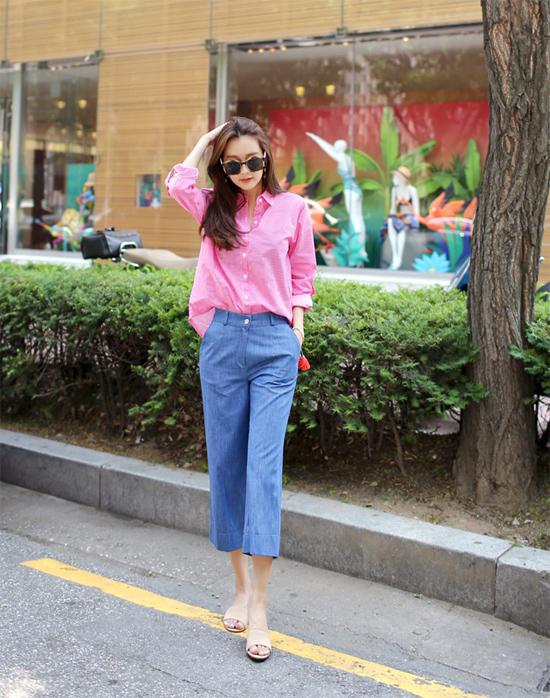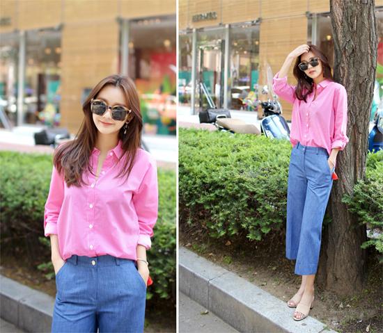 Quần culottes không chỉ "hot" cho các set đồ street style mà ngay cả nơi công sở, bạn cũng có thể mặc chiếc quần thời thượng này. Khi kết đôi áo sơ mi quần và quần culottes màu xanh bạn sẽ có diện mạo trang nhã, thời thượng. Dáng quần cũng giúp cho bạn gái sở hữu đôi chân thô, cong che lấp được khuyết điểm.