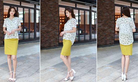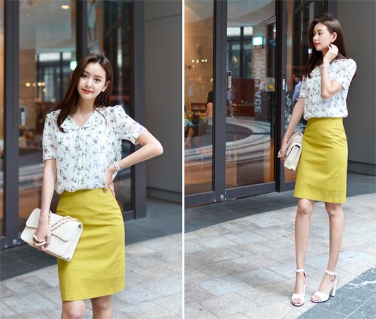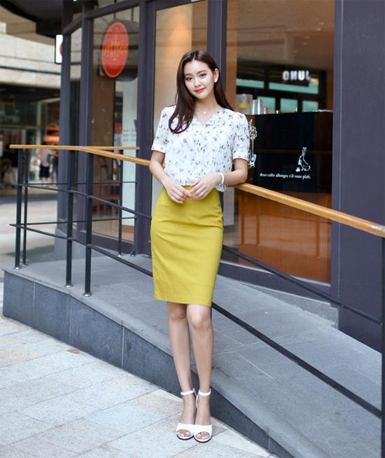 Bạn là cô gái nữ tính và điệu đà thì lựa chọn áo sơ mi họa tiết và chân váy bút chì vàng là vô cùng hấp dẫn. Bộ phụ kiện túi xách, xăng đan trắng càng khiến bạn thêm thú vị, nền nã.