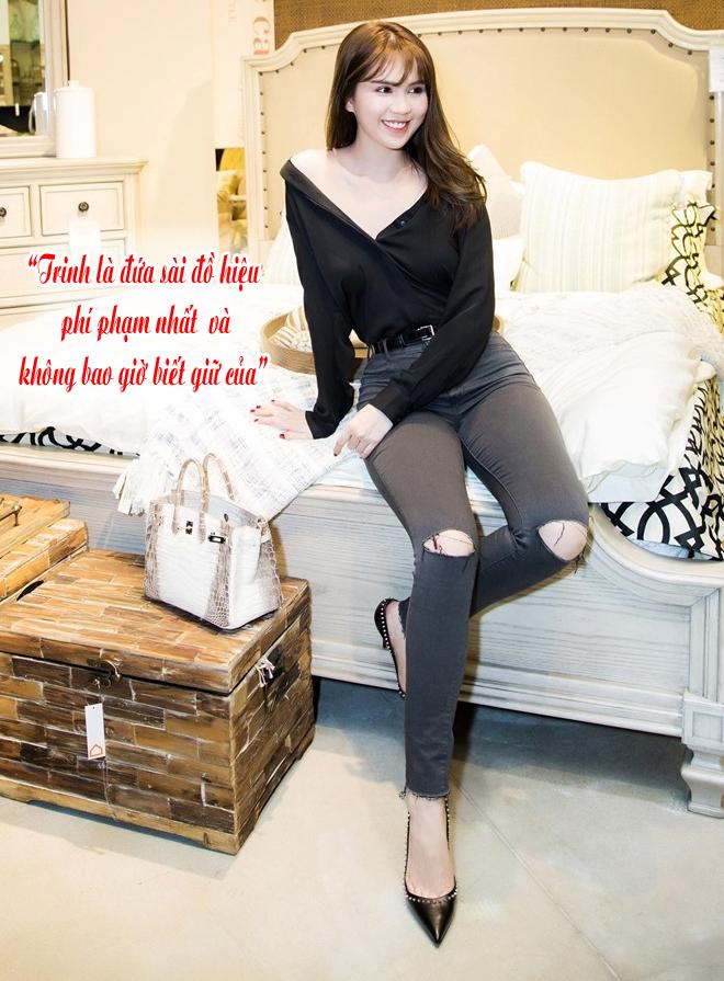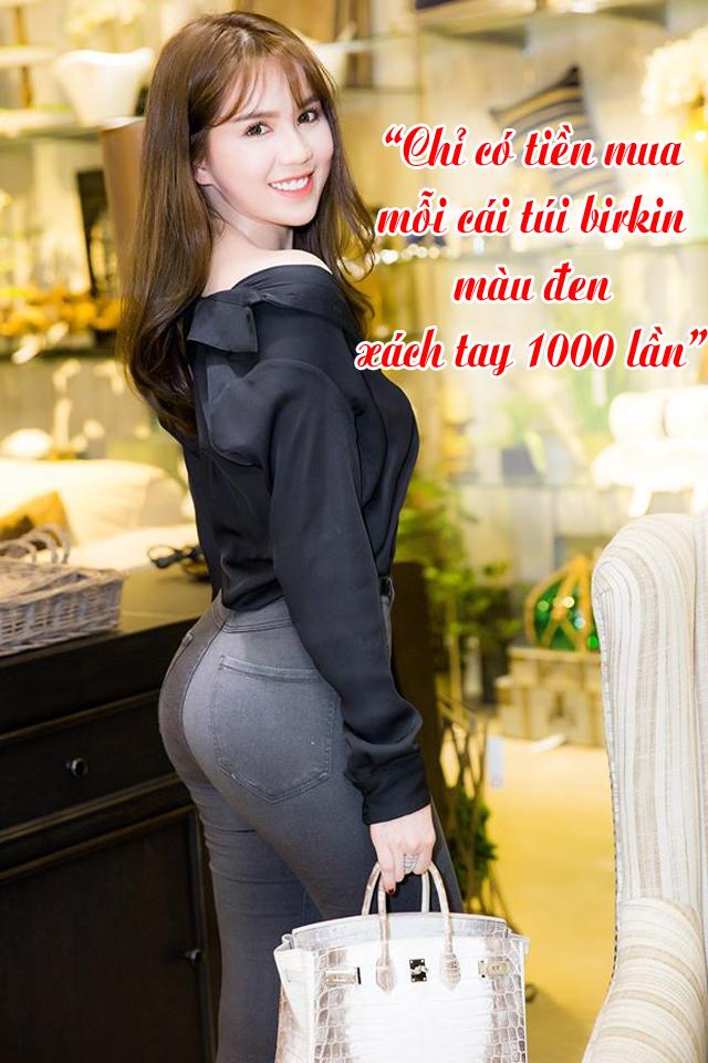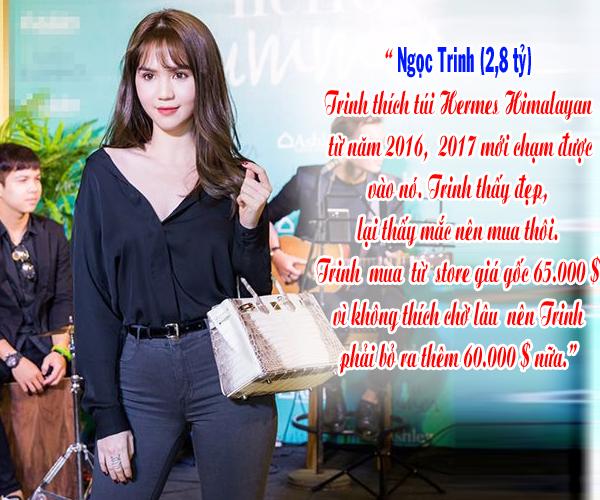 Mặc cho đối phương đã gỡ dòng trạng thái "xách túi Birkin đi chợ Bến Thành", người đẹp sinh năm 1989 vẫn hăm hở chứng minh với truyền thông: “Trinh thích Hermes Himalayan từ năm 2016. Năm 2017 mới chạm được vào nó. Trinh thấy đẹp, lại đắt nhất nên mua thôi… Không thích chờ lâu nên Trinh phải bỏ thêm 60.000 USD nữa”. Ngọc Trinh cũng tuyên bố tự hào rằng đi ngoài trời mưa, những người khác ôm túi hàng hiệu vào bụng, còn cô sẵn sàng lấy túi che đầu mình.