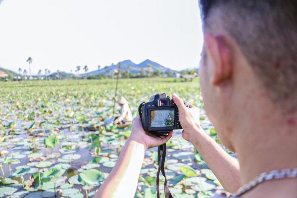 Phan Thanh Nguyên, sinh viên ĐH Sư phạm - ĐH Đà Nẵng tìm đến để chụp hình, lưu lại những kỷ niệm đẹp bên những đóa sen tinh khôi trước khi mùa hè trôi qua. “Em tình cờ đi qua và thấy cánh đồng sen này, tranh thủ mùa sen đang đẹp nên đến đây để chụp hình. Tuy thời tiết nắng nóng, nhưng được nhìn ngắm vẻ đẹp tinh khiết, hương thơm nhẹ nhàng của hàng nghìn bông sen em cảm thấy bình yên, thư thả”, bạn Nguyên cho biết.
