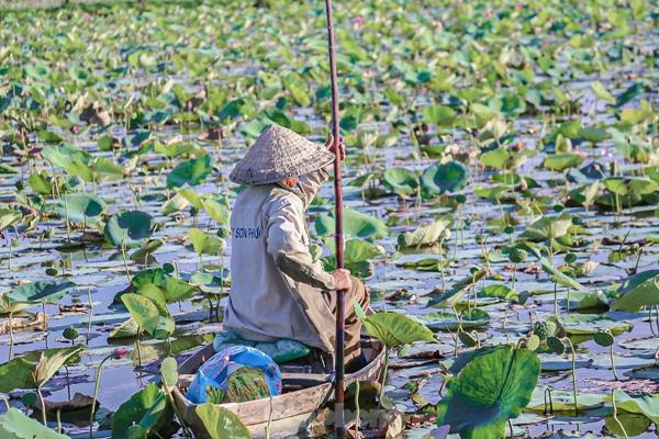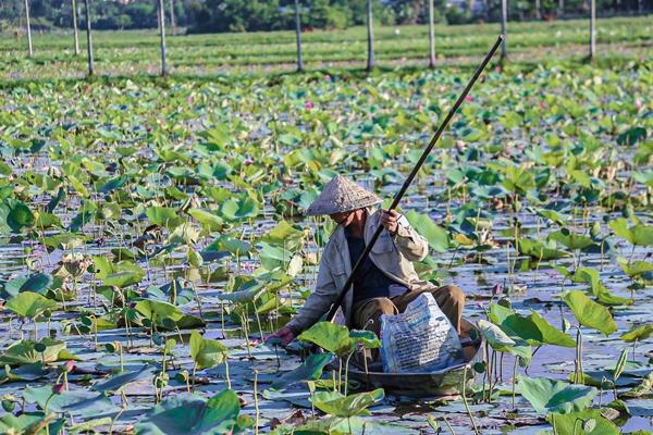 Người dân thu hoạch đài sen để làm các sản phẩm như trà sen, chè sen…