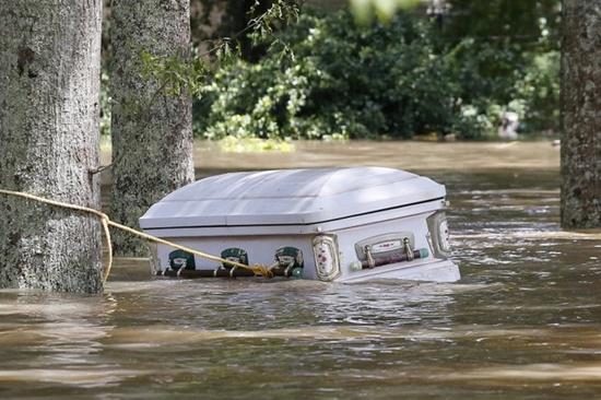 Trong số những cảnh tượng đáng sợ trong đợt mưa lũ lịch sử này, một người dân có tên Anna Johnson đã ghi nhận được những hình ảnh rợn người khi những chiếc quan tài bật khỏi nghĩa trang và trôi nổi lềnh bềnh trên đường phố ngập nước.