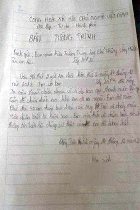 Báo cáo của lãnh đạo Trường THPT Ứng Hòa B gửi Công an xã Đồng Tân cho biết: “Em H. đã bị đứt ở cổ tay trái khá nặng, hiện đã được giáo viên và nhà trường đưa lên bệnh viện đa khoa khu vực Đồng Tân sơ cứu, sau đó gia đình đã đưa em H. lên bệnh viện Đa khoa Vân Đình cấp cứu. Sự việc xảy ra quá nhanh…”