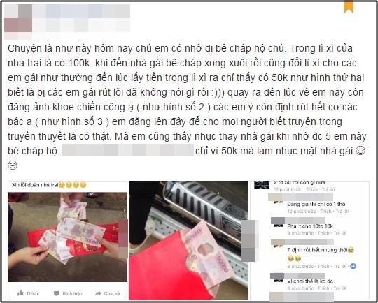 Mới đây, một anh chàng sau khi đi bê tráp đã chia sẻ một câu chuyện dở khóc dở cười khi bị cô nàng "đỡ" tráp bên nhà gái lấy mất tiền bê tráp. Thậm chí, cô nàng lấy tiền kia còn thoải mái "khoe" hành động của mình trên mạng xã hội, anh chàng kể lại: "Trong lì xì của nhà trai có 100.000 đồng, khi đến nhà gái bê tráp xong xuôi cũng đổi lì xì đến lúc lấy tiền ra chỉ thấy có 50.000 đồng. Quay về các em này còn đăng ảnh khoe chiến công, và còn định rút hết cơ ạ".