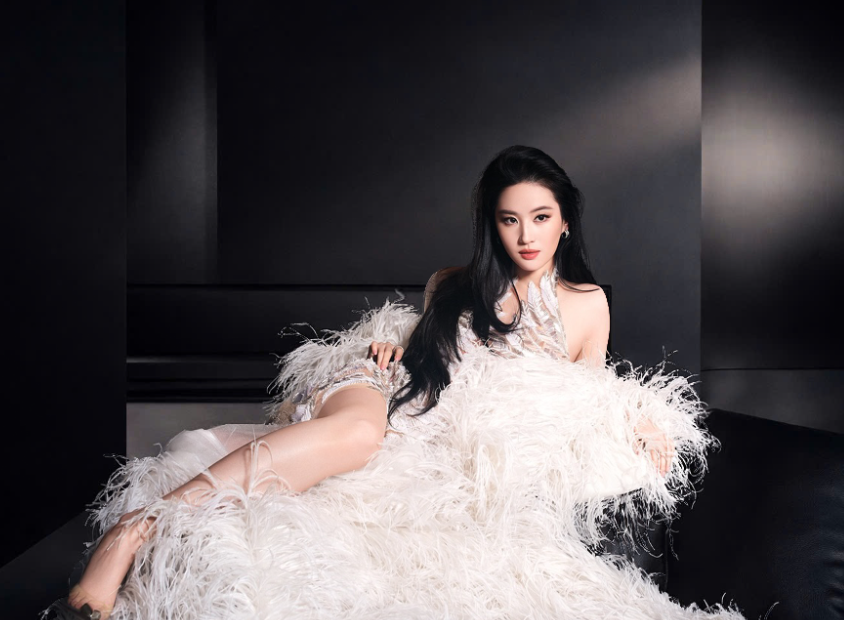 Trong hình ảnh quảng cáo mới đây của Lưu Diệc Phi với một tập đoàn công nghệ, nữ diễn viên mặc thiết kế ôm sát, xẻ tà cao của Lê Thanh Hòa. Bộ đồ có chất liệu xuyên thấu với họa tiết đôi cánh được sắp xếp đối xứng.