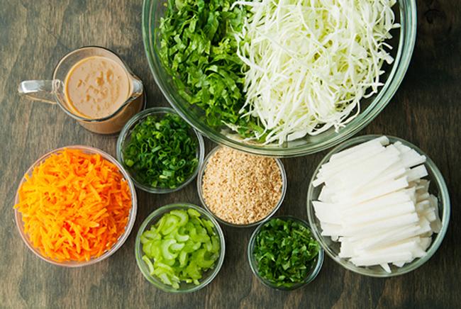 Nước sốt cho món salad: bơ đậu phộng, mật ong, giấm gạo, nước tương, dầu mè, gừng tươi, tỏi và dầu ớt.