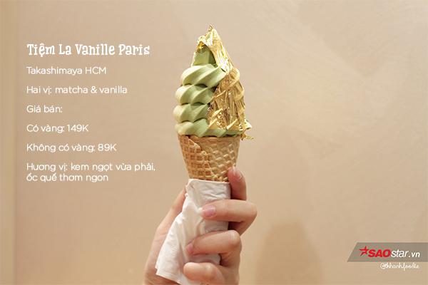 Toạ lạc trên tầng B2 của trung tâm thương mại Saigon Centre, tuy chỉ là một quầy kem bé xinh nhưng La Vanille Paris nhanh chóng được biết đến bằng món kem dát vàng độc đáo của mình. Đầu tiên, kem khéo léo được bắt trong cuộn ốc quế, có hai vị chính là Vanilla và Matcha Nhật Bản. Bạn có thể lựa chọn một trong hai vị theo sở thích, hoặc thậm chí kết hợp cả hai vị trong một cây kem.