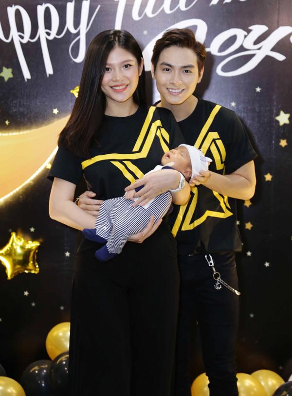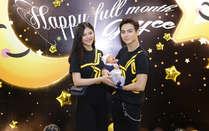Chúng Huyền Thanh và ông xã Jay Quân mặc đồ đôi chào đón bạn bè, người thân tới chung vui, chúc phúc cho quý tử đầu lòng trong lễ đầy tháng Joyce vào tối 27/6 mới được chia sẻ.