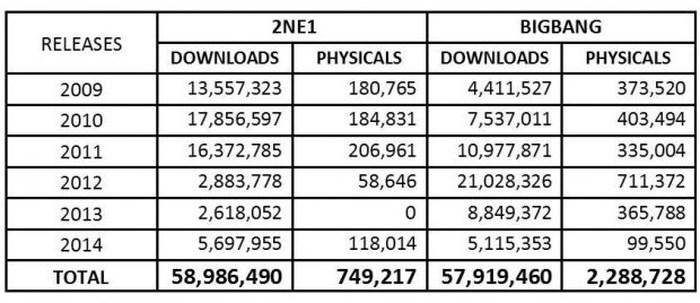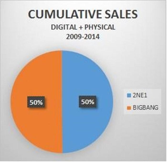 Số liệu sale digital giai đoạn 2009 - 2014 cho thấy thu nhập của 2NE1 cũng không thua kém gì mà có năm còn vượt hơn BigBang.