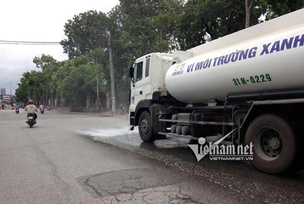 Khoảng 15h ngày 28/7, trên đường Đại Cồ Việt (Hà Nội) xuất hiện xe rửa đường BKS 31H-0229 có dán logo Urenco (công ty TNHH MTV Môi trường đô thị Hà Nội) đang phun nước.