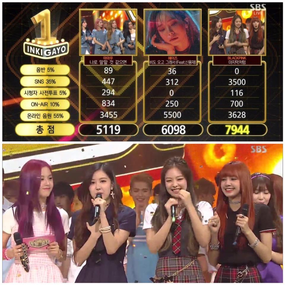 Nhóm nhạc nữ BLACKPINK giành chiến thắng trên sân khấu Inkigayo trước MAMAMOO và Heize, đây cũng là chiến thắng liên tiếp trong 3 tuần của nhóm