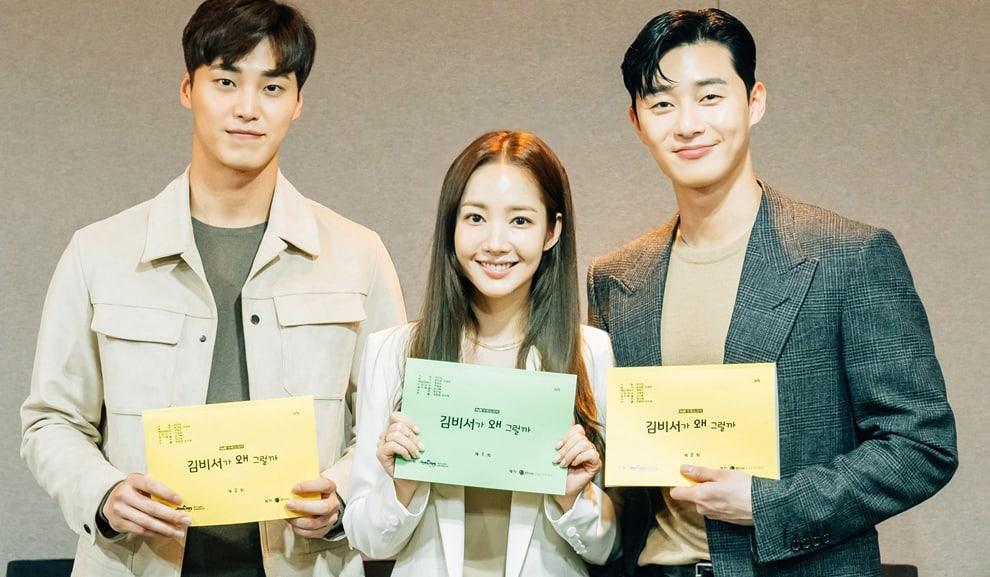 Park Seo Joon, Park Min Young, Lee Tae Hwan tại buổi đọc kịch bản drama "Why Secretary Kim". Phim được chuyển thể từ bộ truyện tranh cùng tên, dự kiến lên sóng đài tvN vào tháng 6 tới