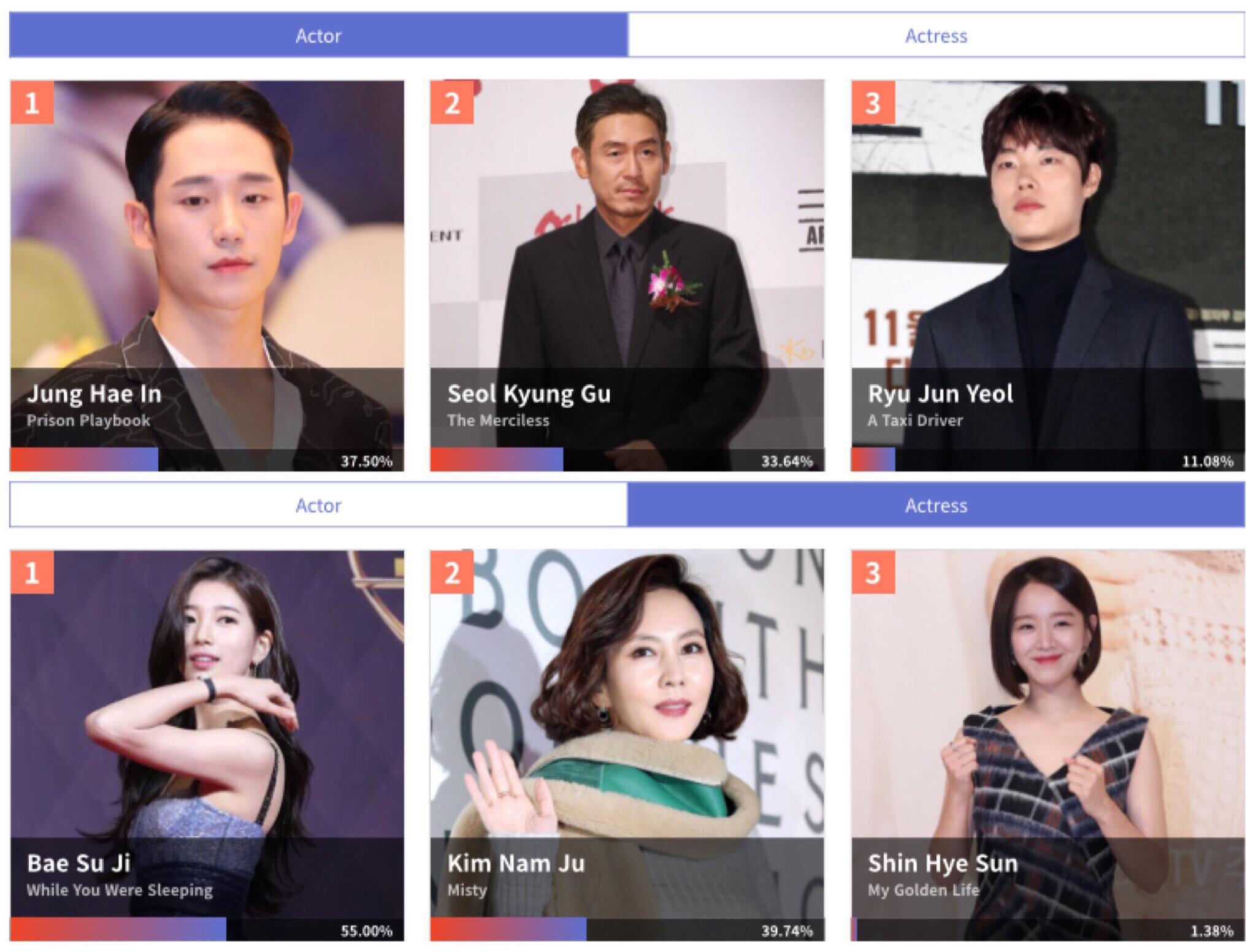 Suzy và Jung Hae In sẽ tái ngộ tại Lễ trao giải Baeksang lần thứ 54 vào ngày 3/5 sắp tới. Cả hai đứng đầu hạng mục giải Nam Nữ diễn viên được yêu thích nhất (Popularity Awards) do khán giả bình chọn. Suzy và Jung Hae In từng cùng hợp tác chung trong bộ phim "Khi nàng say giấc" vào năm 2017